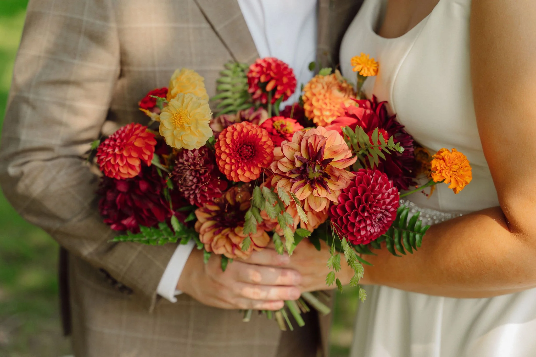 Jatnaa + Khadijah’s wedding was a lesson that some of the best things come through improvisation, as we sourced Firebush from our own gardens to be included in their arrangements. The leaves were all at different stages of changing to red and the branches tied in some color from every flower we had. Their arch and tall centerpieces showed the full gradient of color changes that happen in Fall.