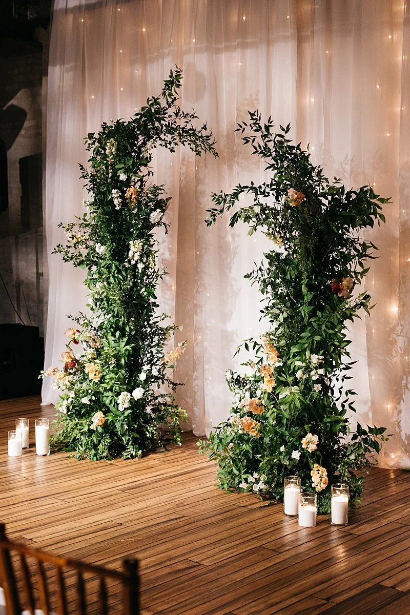 The asymmetrical pillars beautifully mirrored the hanging flower installation overhead during the ceremony, with everything adorned with lush greenery and pops of their muted but warm palette. The soft apricot tones were our particular favorite.