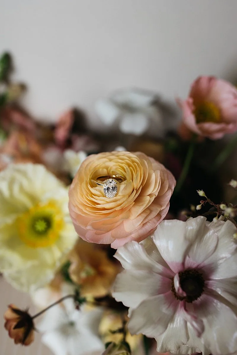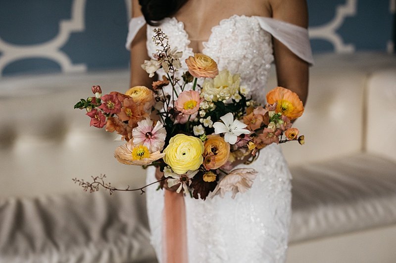 Dao's bouquet was a dream to design with the warmer pastels and free-form florals, and we loved making the complementary bridesmaids' arrangements and boutonnieres in the cooler sunset tones, but the hanging installation design was the piece that ruled the day for us.
