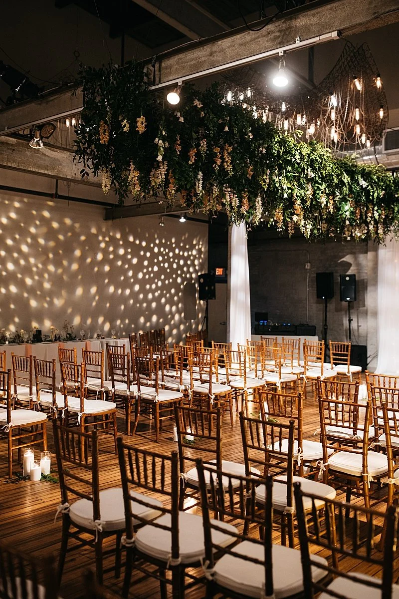 While every hanging flower installation needs to be designed specifically for the space and type of blooms used, this design had to fit within the venue's rules, complement the non-traditional existing light structure, and be visually captivating in a busy industrial space. The sheer number of ideas and possibilities that we explored was tremendous.