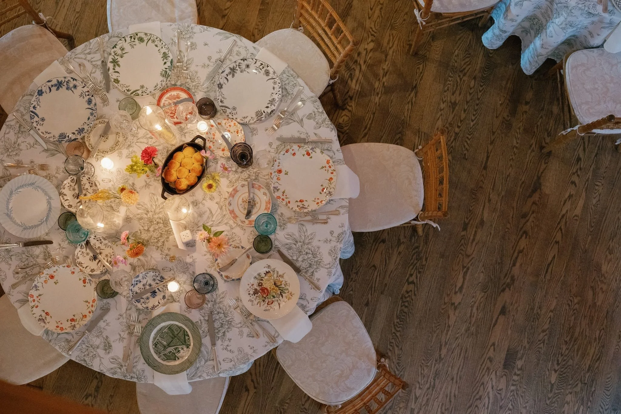 Instead of sticking to one unified design scheme, the approach embraced curated contrast. Bold design choices, like placing peach candles in hurricanes beside soft florals and Chinoiserie fabrics, created a visually rich, layered environment.